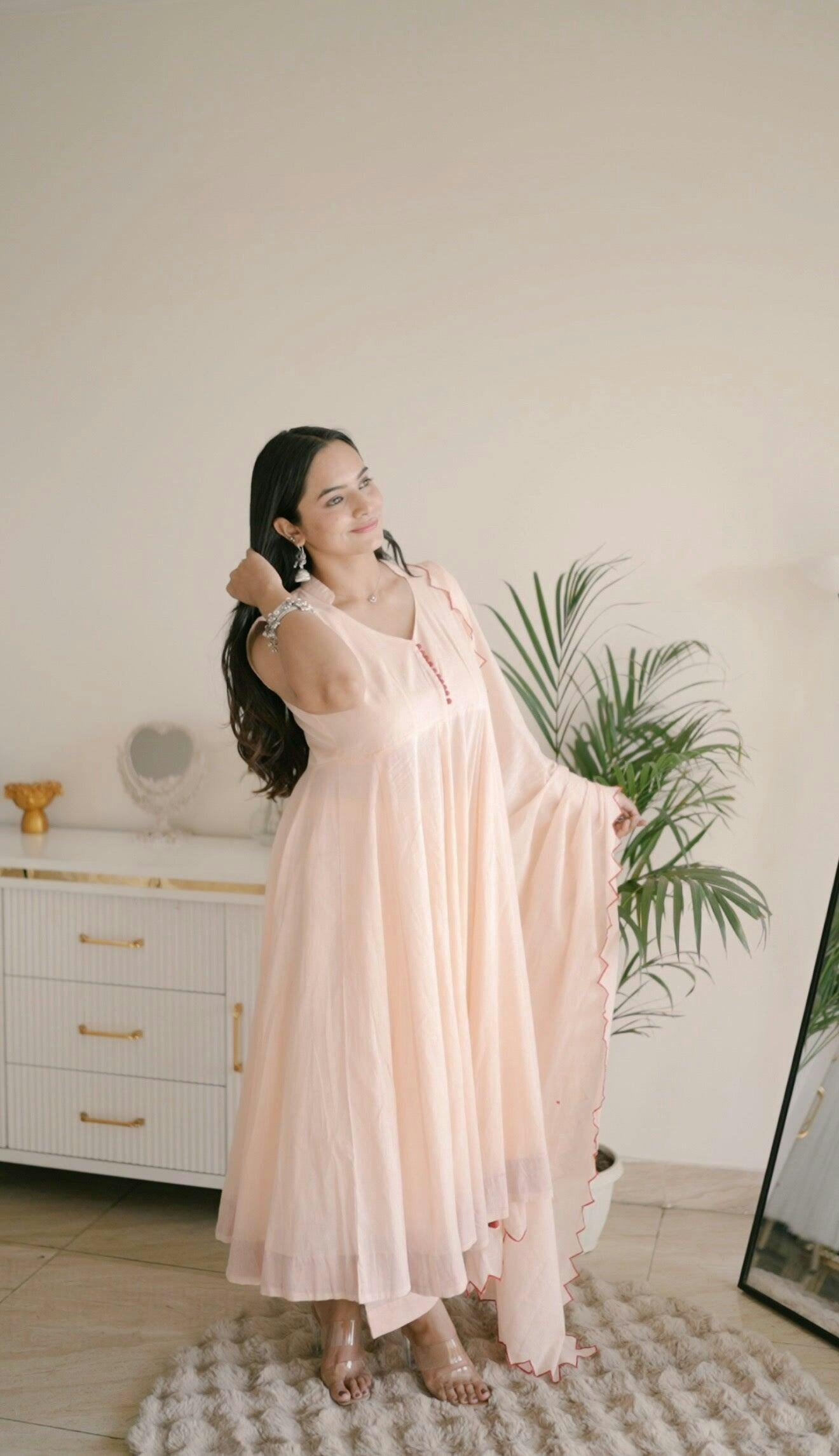 Radiate effortless charm in our Peach Mulmul Sleeveless Anarkali Suit Set, crafted in soft and breathable mul mul cotton. The kurta features a kali flare for beautiful volume and movement, enhanced with contrast piping on the collar neck and hem, giving a refined and structured silhouette. The collar neck Anarkali suit design adds a contemporary twist to this otherwise classic ethnic look.